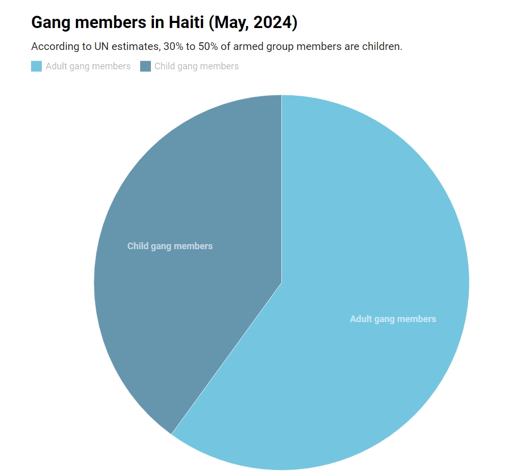 In May 2024, the UNICEF estimated that 30-50% of criminal organization members are children. This includes boys who are younger than 10 years of age. Most recently, the UN Children's Fund has claimed that the number of children being recruited into gangs in Haiti has increased by 70% over the past year.